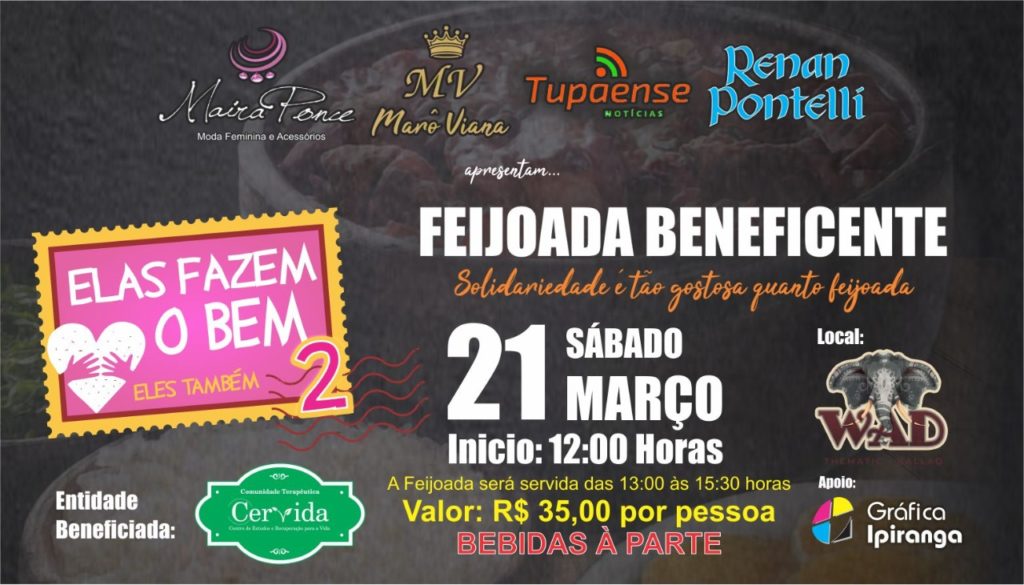 Convites a venda para evento Elas Fazem o Bem 2, a feijoada acontece em 21 de março na WAD, em prol do CERVIDA