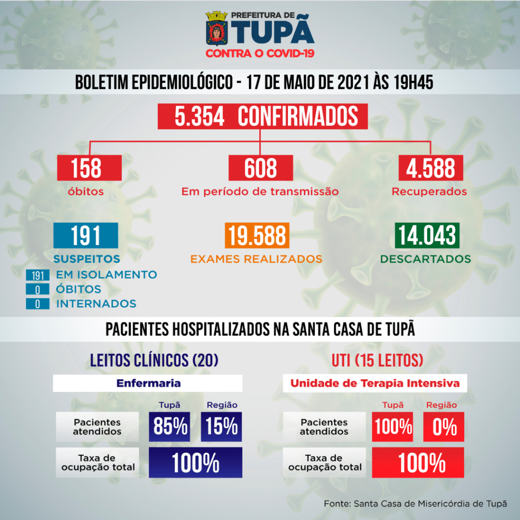 A taxa de ocupação dos leitos de UTI da Santa Casa local continua em 100%, com os 15 leitos ocupados por pacientes de Tupã (100% do total). Já a taxa de ocupação dos 20 leitos clínicos (enfermaria) destinados aos pacientes de coronavírus também está em 100%, com 17 pacientes de Tupã (85%) e 3 pacientes da região (15%), sendo 1 de Bastos e 2 de Iacri.