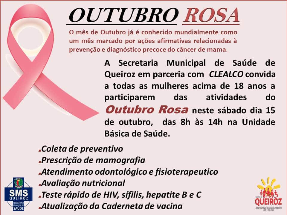 A fim de conscientizar e alertar as mulheres e a sociedade sobre a importância da prevenção e diagnóstico precoce do câncer de mama e também sobre a saúde da mulher, a Prefeitura de Queiroz, por meio da Secretaria de Saúde em parceria com a Clealco, promoverá diversas atividades em alusão à campanha “Outubro Rosa”.