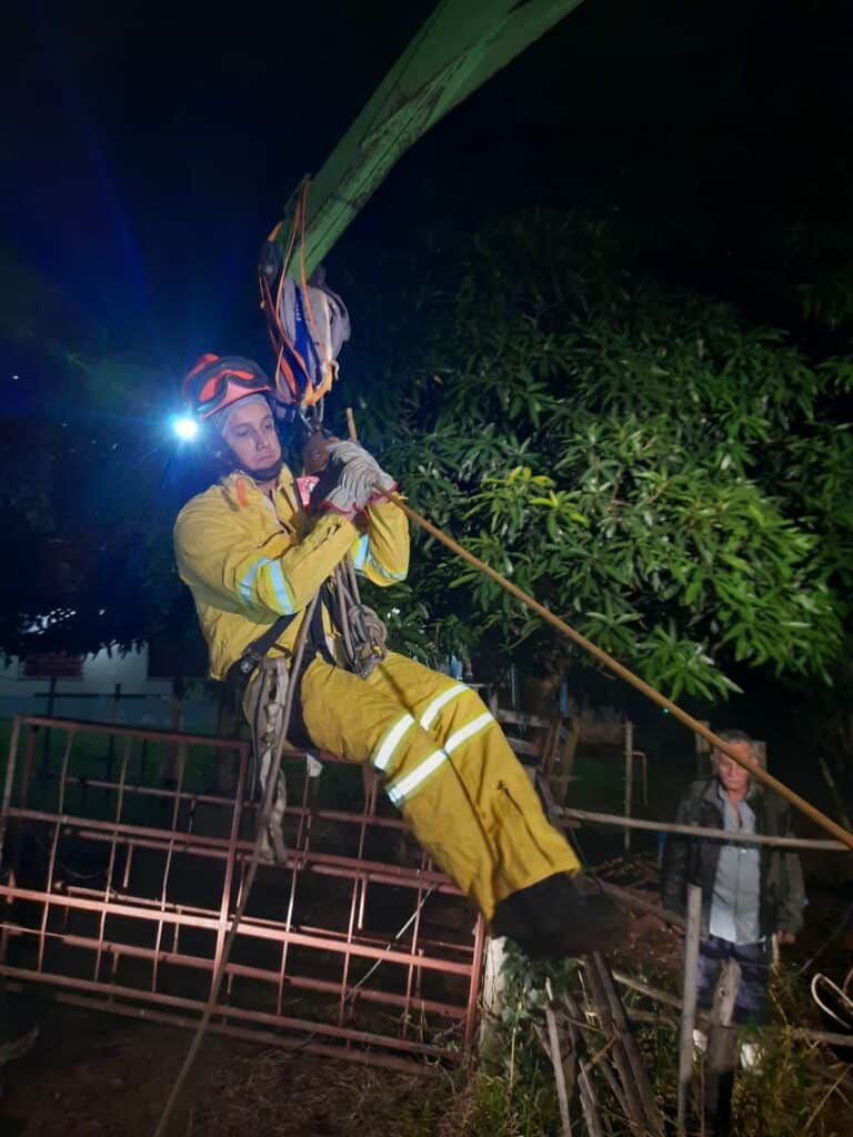 Ao chegar à propriedade rural, a equipe de resgate constatou que a vaca estava presa dentro do poço e que era necessário utilizar técnicas de Salvamento Terrestre e Salvamento em Altura para retirá-la do local.
