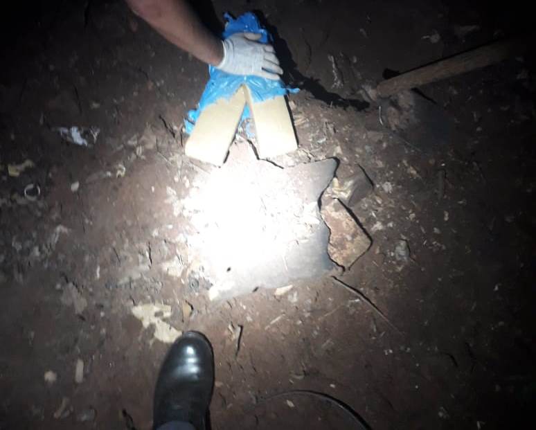 No imóvel, que teve sua entrada franqueada pela responsável, foi encontrado 1 tijolo de maconha, em um terreno vizinho que estava com sinais de recém manejado, mais 2 tijolos de maconha, iguais ao primeiro.