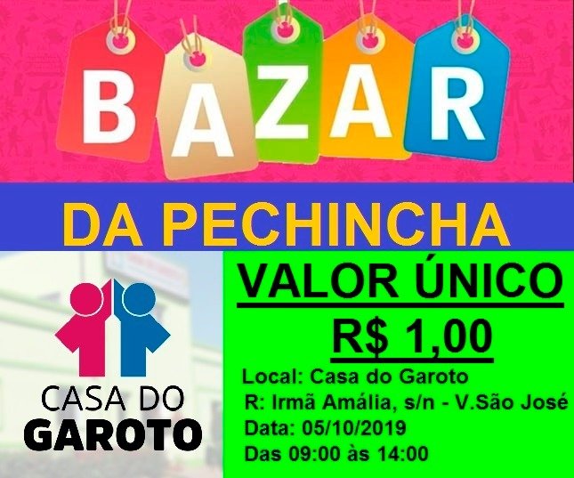 Quer andar na moda gastando pouco, esta é sua oportunidade no BAZAR DA PECHINCHA, que acontece no dia 05 de outubro na Casa do Garoto, tudo a partir de R$ 1,00