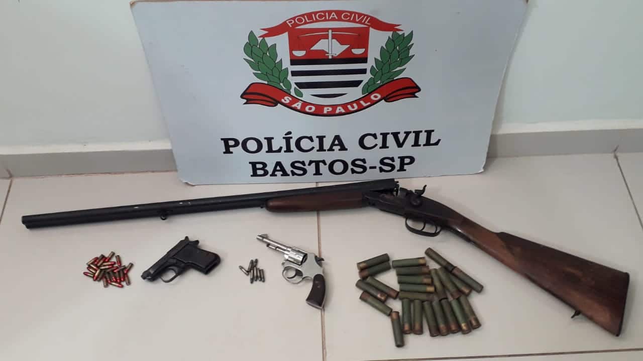 No início da manhã desta segunda-feira, os Investigadores de Polícia do Setor de Investigações Gerais da Delegacia de Polícia de Bastos efetuaram a apreensão de uma espingarda calibre 28, um revólver calibre 22, uma pistola calibre 6.35 e ainda vinte e três munições calibre 28, sete munições calibre 22 e vinte e duas munições calibre 6.35.