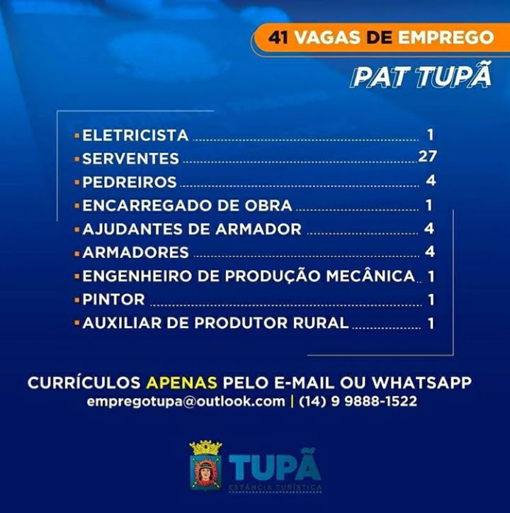 O Posto de Atendimento ao Trabalhador (PAT), órgão da Prefeitura Municipal, mantido pela Secretaria de Desenvolvimento Econômico e Comércio Exterior, divulga 41 vagas disponíveis a partir desta quarta-feira (27) para Tupã.