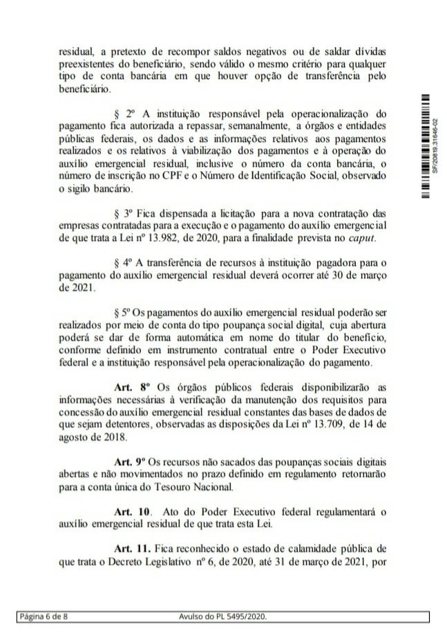 O texto inicial diz que: “Fica instituído, até 31 de março de 2021, o auxílio emergencial residual a ser pago em parcelas mensais no valor de R$ 300,00 (trezentos reais) ao trabalhador beneficiário do auxílio emergencial de que trata o art. 2º da Lei nº 13.982, de 2 de abril de 2020, a contar da data de publicação desta lei”. Veja o texto na íntegra abaixo.