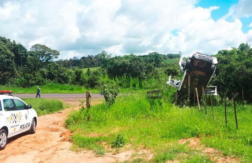 O carro bateu em barranco, capotou algumas vezes e só parou ao ficar preso em uma cerca, na vertical e de cabeça para baixo.