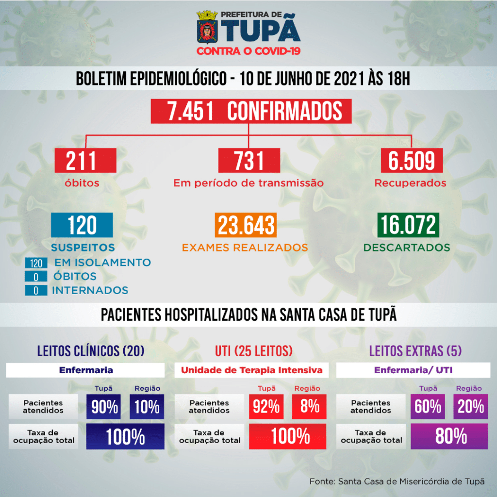 A prefeitura já realizou um total de 23.643 exames, com 16.072 resultados negativos. Já o número de casos confirmados chega a 7.451, sendo 731 ainda em período de transmissão. A cidade conta com 120 casos suspeitos e até o momento, 6.509 pacientes já se recuperaram da doença em Tupã.
