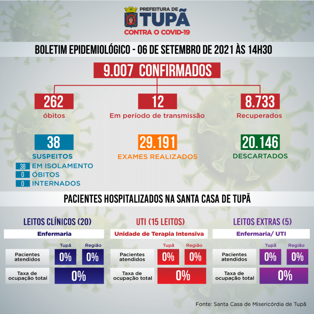 A prefeitura já realizou um total de 29.191 exames, com 20.146 resultados negativos. Já o número de casos confirmados chega a 9.007, sendo 12 ainda em período de transmissão. A cidade, que conta com 38 casos suspeitos e até o momento, 8.733 pacientes já se recuperaram da doença em Tupã. Outra boa notícia é que a cidade continua com a ala Covid zerada. Nenhum paciente está internado nos 15 leitos de UTI, nos 20 leitos de enfermaria e nos 5 leitos extras.