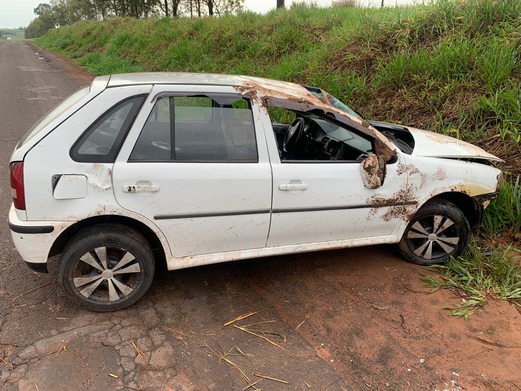 Um veículo Gol capotou na manhã desta quarta-feira (12), às 6h20 na SP 383 Rodovia Miguel Gantus sentido Tupã/Queiroz.