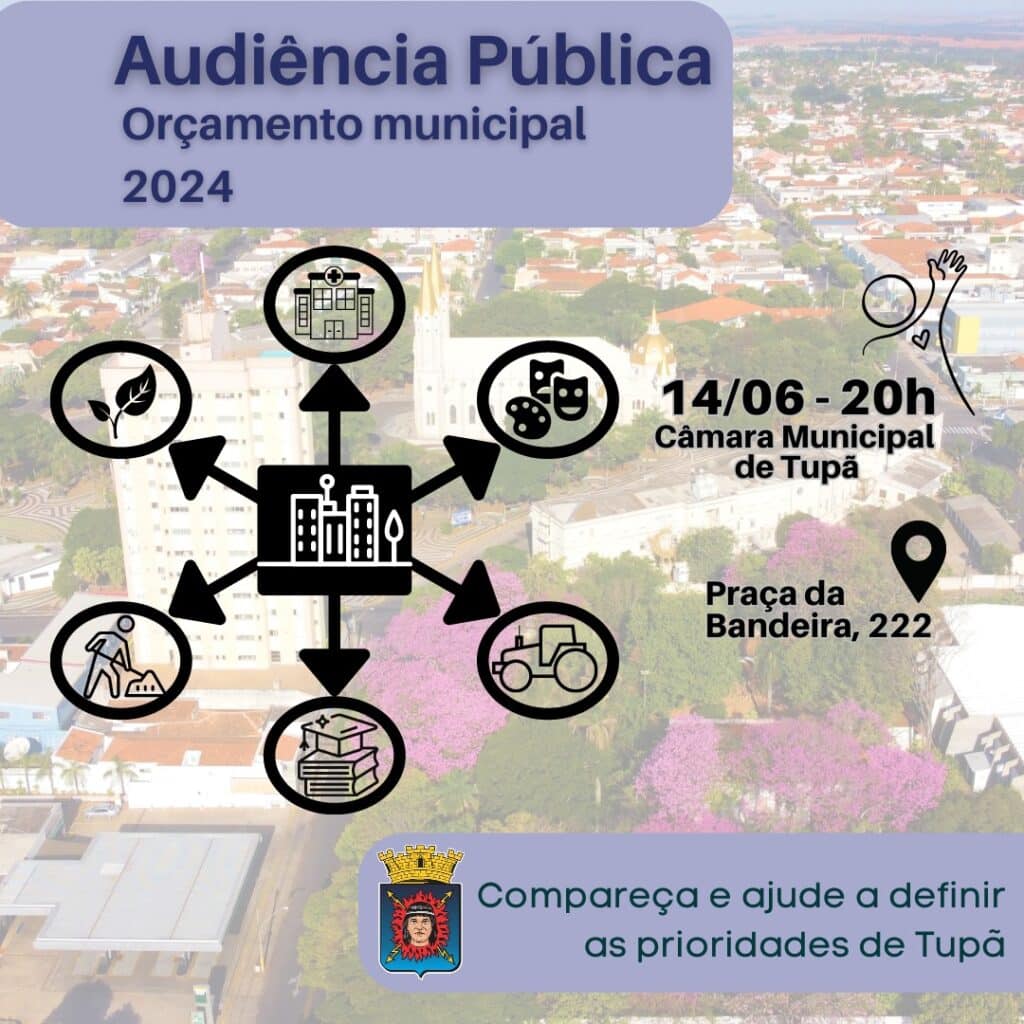 A Câmara Municipal da Estância Turística de Tupã realizará em suas dependências, na Praça da Bandeira, 222, dia 14 de junho de 2023, às 20 horas, Audiência Pública para apresentação e discussão da proposta do Poder Executivo para a Lei de Diretrizes Orçamentárias (LDO) referente ao exercício de 2024.
