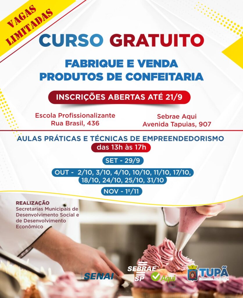Ambas as formações têm limite de 16 alunos por turma, a de confeitaria será das 13h às 17h; e a de salgados, das 18h às 22h.