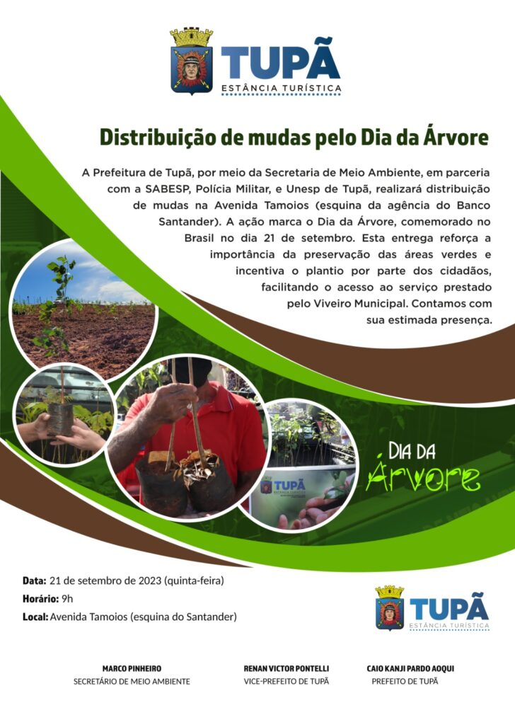 Quinta-feira (21), na avenida Tamoios (em frente ao Banco Santander), equipes da Pasta responsável, em parceria com a SABESP, Polícia Militar e Unesp de Tupã, realizarão a entrega de mudas de árvores para todas as pessoas interessadas.