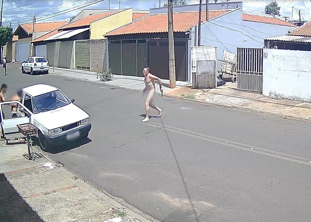 Na sequência, o vídeo mostra duas pessoas saindo da residência, sendo que a vítima está sangrando na região do peito. O suspeito do crime aparece logo atrás, desta vez nu. Ele segura duas facas e passa a perseguir a dupla de pai e filho.