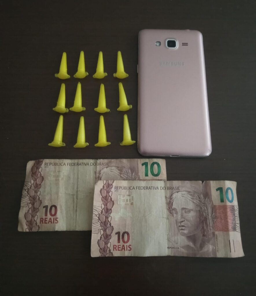 Devidamente abordado, foram encontrados 12 ependorfs contendo uma substância em pó branco semelhante a cocaína em posse de V. F. A. S., além de R$20 em dinheiro. O mesmo admitiu estar envolvido com o tráfico.
