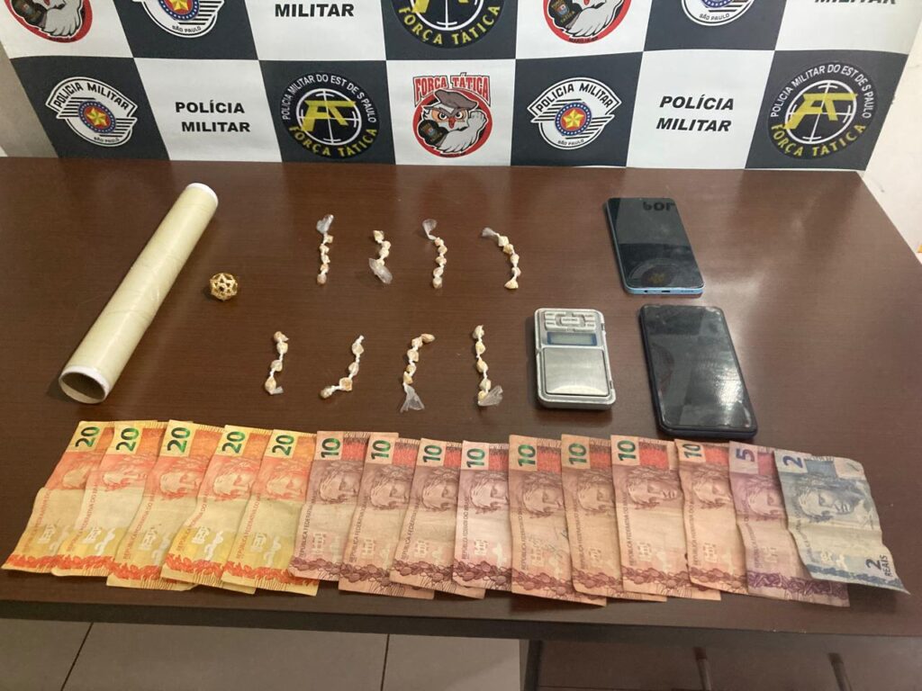 Os policiais entraram no local e abordaram também K.S.C., de 17 anos. Durante a revista, foram encontrados no imóvel uma balança de precisão, um celular, duas embalagens contendo 30 pedras de crack, R$187 em dinheiro trocado e materiais para embalar drogas.