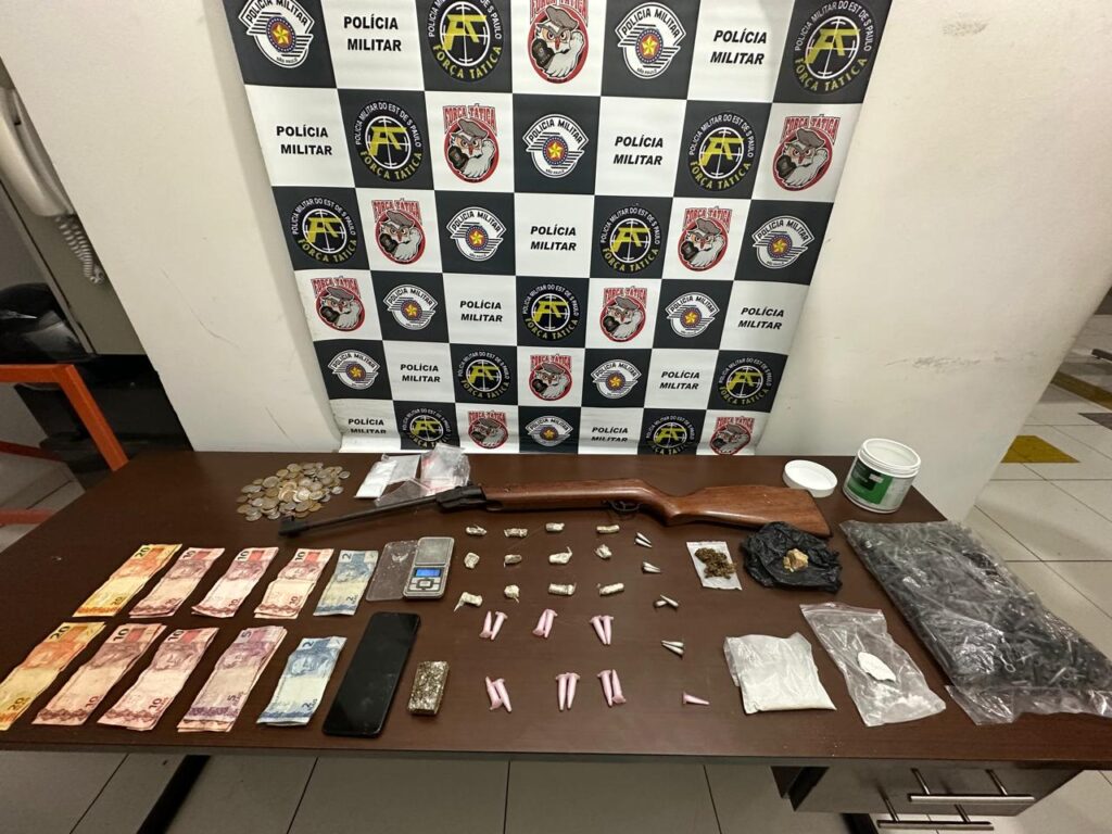 Durante buscas na área externa, foi localizada ainda uma espingarda, de pressão, usada para intimidar usuários. Inicialmente, L. R. M. negou ser o dono das drogas e da arma, mas depois assumiu a propriedade de todo o material apreendido.