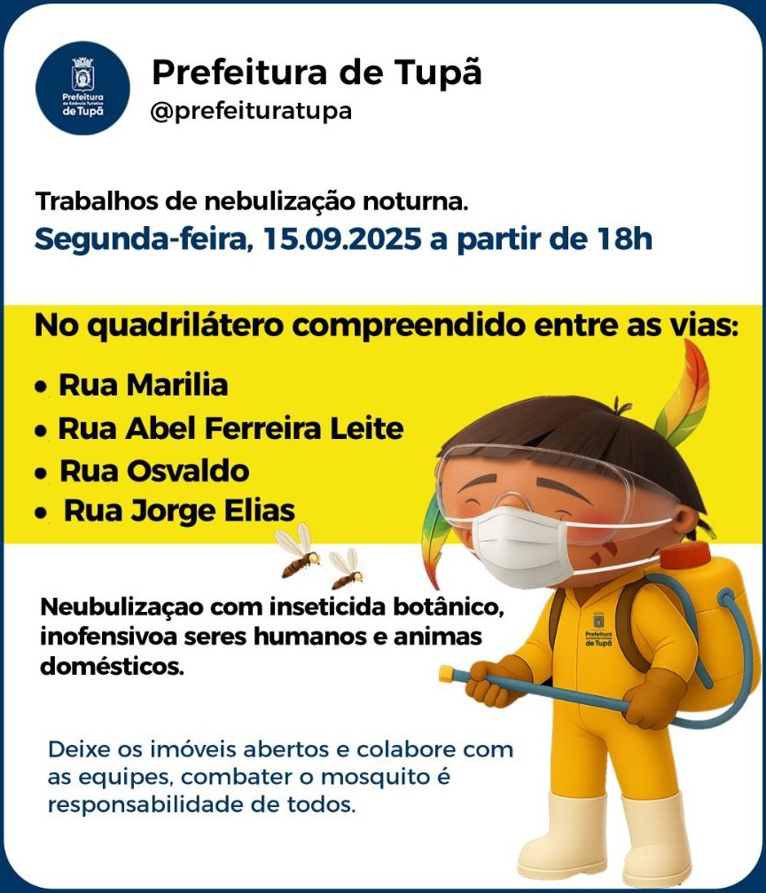 A Prefeitura recomenda que os moradores da área mantenham portas e janelas abertas durante a aplicação para garantir maior eficácia da nebulização.