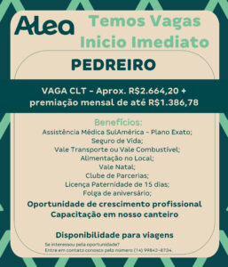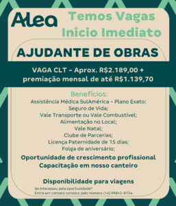 O Grupo Alea busca preencher vagas para ajudantes de obras, pedreiros, pintores, eletricistas, ceramistas e encanadores, com início imediato e registro em carteira. Os salários variam conforme a função: ajudantes recebem R$ 2.189,00 mais premiação mensal de até R$ 1.139,70; pedreiros, ceramistas, pintores e encanadores têm salário base de R$ 2.664,20 e premiação que pode chegar a R$ 1.386,78.