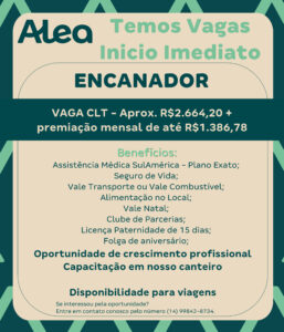 Os candidatos precisam ter disponibilidade para viagens e passarão por treinamento, com chances reais de crescimento dentro da empresa. Além da remuneração atrativa, o Grupo Alea oferece benefícios como assistência médica SulAmérica (Plano Exato), seguro de vida, vale transporte ou combustível, alimentação no local, vale natalino, clube de parcerias, licença paternidade de 15 dias e folga no aniversário.