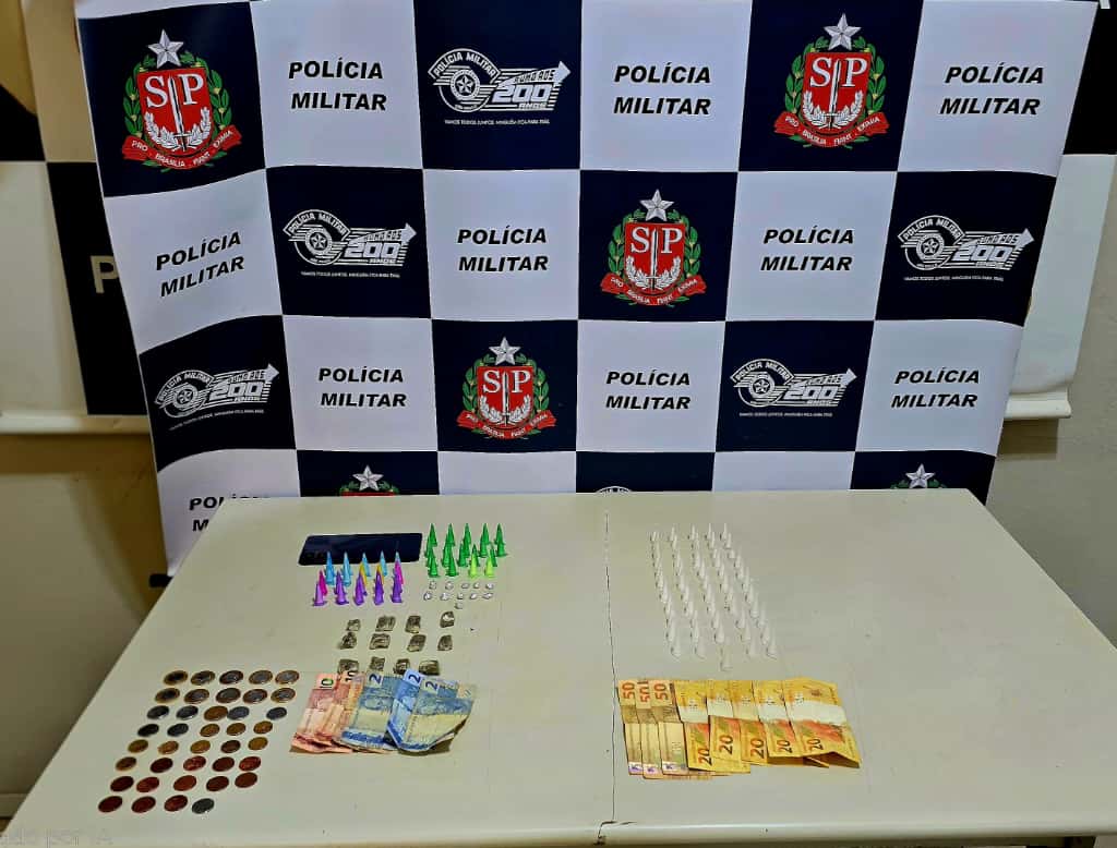 Na residência, a equipe encontrou um adolescente de 17 anos deitado em uma cama, usando o celular. Durante a revista, ao lado do menor foi localizada uma pochete vermelha contendo 39 microtubos de cocaína, 11 porções de crack, 12 porções de maconha e R$ 44,35 em dinheiro.