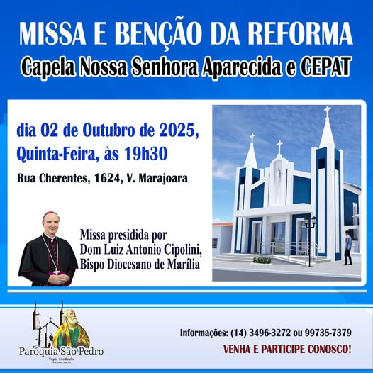A comunidade católica de Tupã se prepara para um momento especial: a missa de bênção da reforma da Capela Nossa Senhora Aparecida e do CEPAT, que acontecerá no dia 2 de outubro de 2025, às 19h30, na Rua Cherentes, 1624, Vila Marajoara.