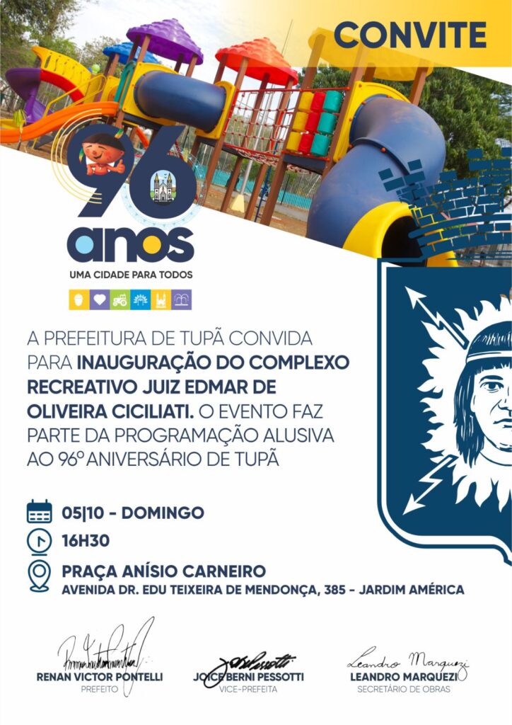 Neste domingo (5), a partir das 16h30, será inaugurado o Complexo Recreativo “Luiz Edmar de Oliveira Ciciliati”, na Praça Anísio Carneiro. Evento faz parte da série de inaugurações programadas para o mês de aniversário da cidade, e contará com brinquedos infláveis para crianças, música, pipoca, algodão doce, e muita animação.
