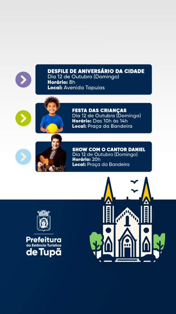 Para celebrar os 96 anos de fundação da cidade, a Prefeitura de Tupã preparou uma programação especial que se estende durante todo o mês de outubro, reunindo eventos culturais, inaugurações de obras e uma grande festa no dia 12, data oficial do aniversário.