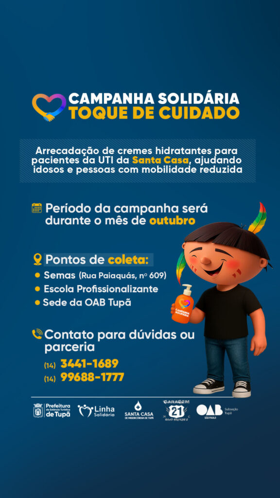 O trabalho vai acontecer durante todo o mês de outubro e as pessoas interessadas em colaborar com a campanha podem fazer doações na sede do Secretaria Municipal de Desenvolvimento Social e Família (rua Paiaquás, 609), na Escola Profissionalizante (rua Brasil, 436) e na sede da OAB Tupã (rua Colômbia, 200).