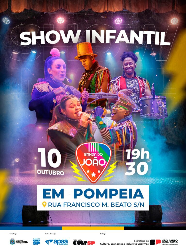 Em comemoração ao Dia das Crianças, Pompeia vai receber um presente especial: a Banda do João fará um show gratuito no dia 10 de outubro, a partir das 19h30, na Feirinha, localizada na Avenida Francisco Marques Beato. O evento é uma realização da Secretaria de Cultura, Economia e Indústrias Criativas do Governo do Estado de São Paulo, gestão e produção APAA – Associação Paulista dos Amigos da Arte, Tudo Vira CultSP e correalização da Prefeitura de Pompeia por meio da Diretoria de Cultura e Circuito CULTSP.
