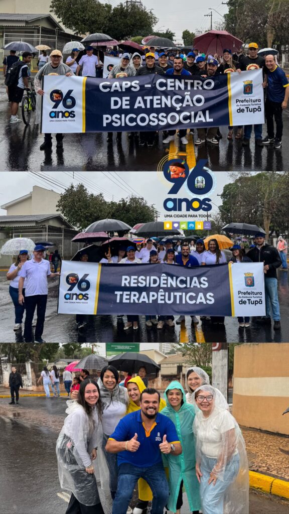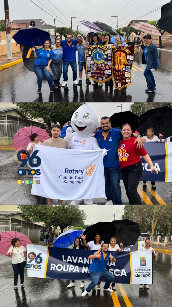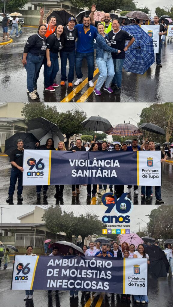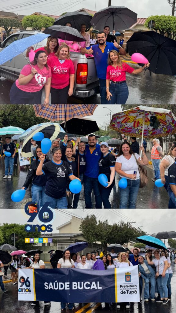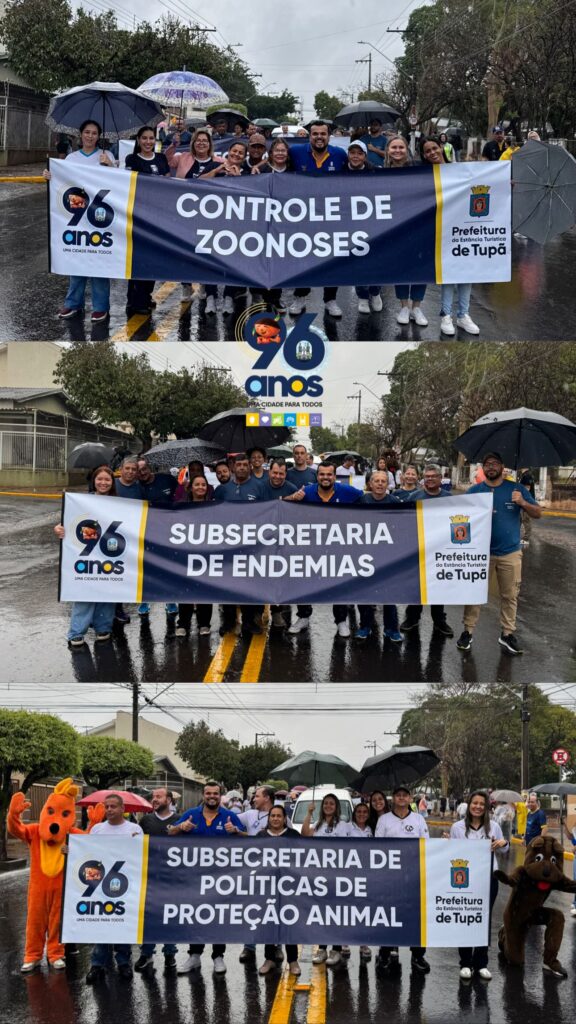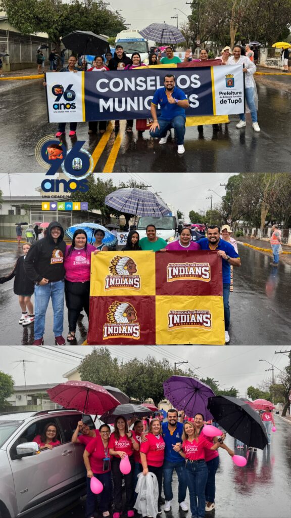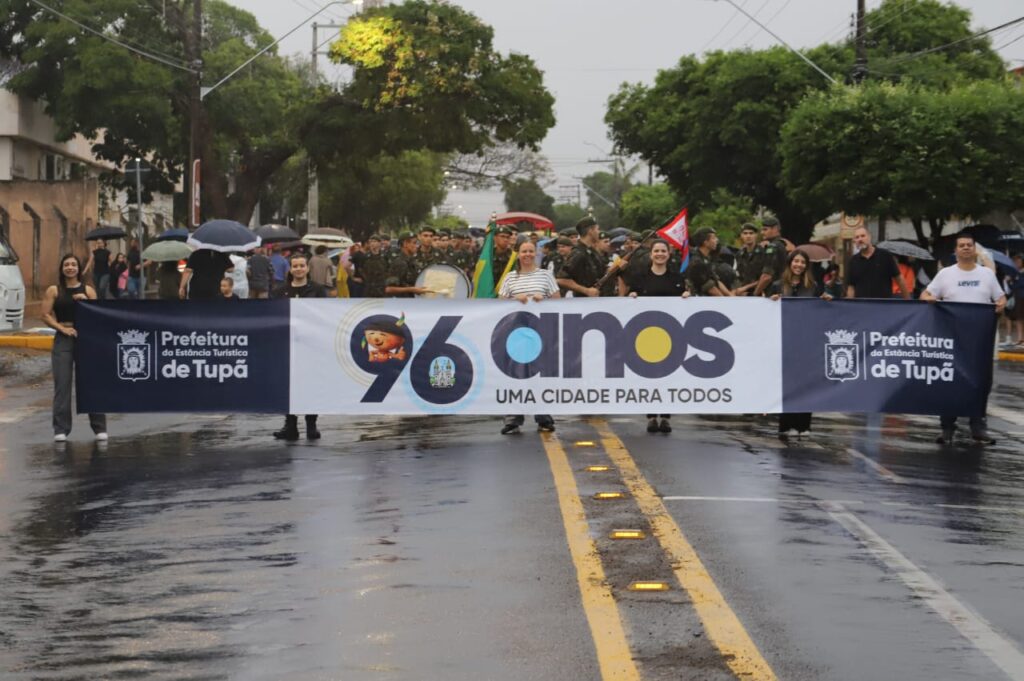 Mesmo sob a chuva que caiu durante toda a manhã deste domingo (12), as comemorações pelos 96 anos de Tupã seguiram firmes e com muito entusiasmo. O desfile cívico, realizado pela manhã na avenida Tapuias, reuniu centenas de participantes e teve mobilização intensa de escolas, faculdades, entidades assistenciais, associações esportivas, clubes de serviço, empresas locais, além das polícias Civil e Militar.