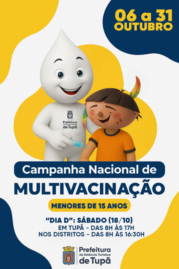 Neste sábado (18), Tupã se mobiliza em prol da saúde. É o Dia D da Campanha Nacional de Vacinação, uma grande ação para atualizar as carteiras de vacinação de crianças e adolescentes de até 15 anos em todas as unidades de saúde do município.