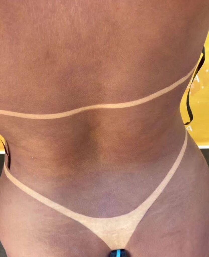 Resultado do bronzeamento personalizado, com biquíni à escolha da cliente.