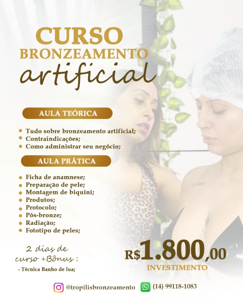 O curso é completo, com aulas teóricas e práticas e bônus exclusivos como técnicas de banho de lua e bronzeamento vertical. O investimento atual é de R$ 1.500,00 para quem garantir a vaga até dezembro. A partir de janeiro, o valor será de R$ 1.800,00.