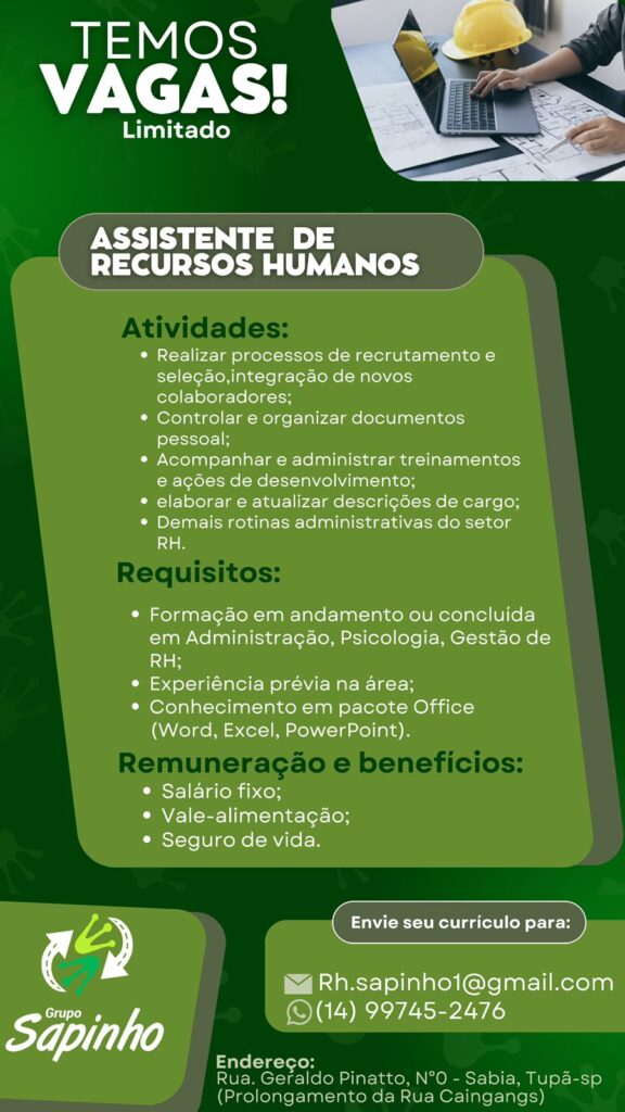 Além das vagas para produção e logística, o GRUPO SAPINHO oferece uma oportunidade para ASSISTENTE DE RECURSOS HUMANOS.