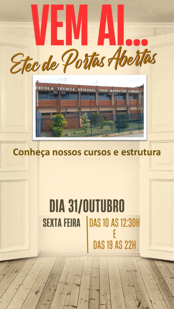 O evento “Etec de Portas Abertas” acontece nesta sexta-feira, dia 31 de outubro, na Etec Prof. Massuyuki Kawano, com o objetivo de apresentar à comunidade os cursos e a infraestrutura da unidade escolar.