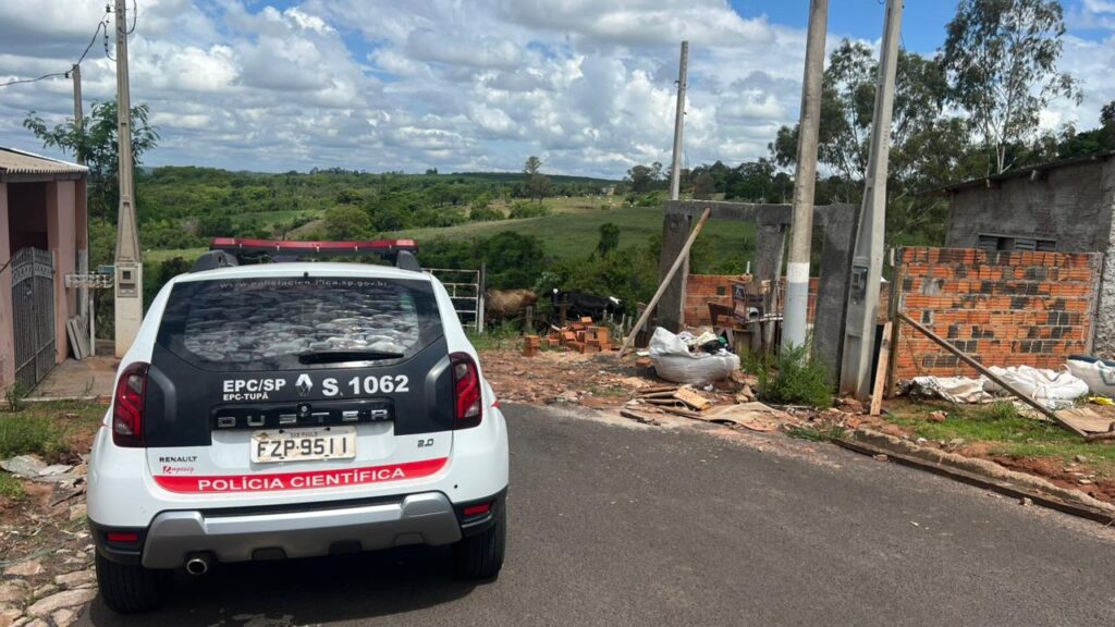 A Polícia Científica, representada por Tadeu e Denise, também esteve no local realizando a perícia.
