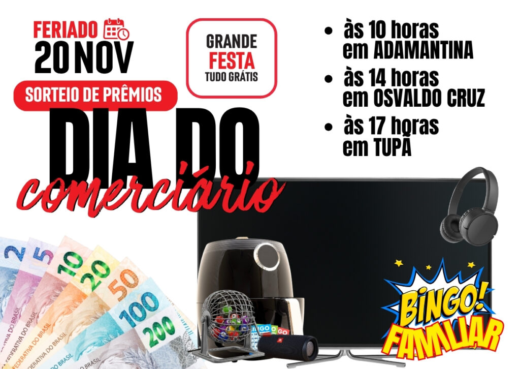O Dia do Comerciário, celebrado em 30 de outubro, terá a sua tão esperada comemoração no dia 20 de novembro, com grandes festas gratuitas promovidas pelo Sincomerciários de Tupã e região. A data, que cai em feriado, reunirá trabalhadores e familiares em três cidades: Adamantina, Osvaldo Cruz e Tupã, com programação especial, bingo cultural, sorteios de brindes e diversas atividades recreativas.