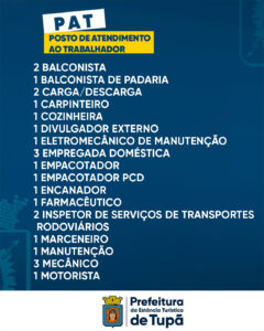 O Posto de Atendimento ao Trabalhador (PAT) de Tupã divulgou nesta quarta-feira, 19 de novembro, uma nova relação de oportunidades de emprego disponíveis no município. As vagas abrangem diferentes níveis de escolaridade e áreas de atuação, oferecendo mais uma chance para quem busca recolocação no mercado de trabalho.