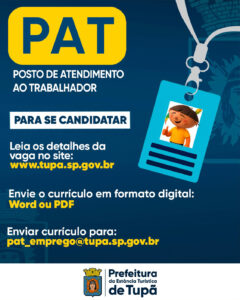Para concorrer, os interessados devem acessar o site oficial da Prefeitura de Tupã (www.tupa.sp.gov.br) e conferir os detalhes completos de cada vaga. Após verificar os requisitos, o candidato deve enviar o currículo atualizado em formato Word ou PDF para o e-mail pat_emprego@tupa.sp.gov.br.