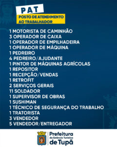 O PAT funciona como um elo entre empregadores e trabalhadores, ampliando as possibilidades de contratação e fomentando o desenvolvimento econômico local. As vagas são atualizadas frequentemente, e os interessados devem acompanhar as publicações oficiais para não perder novas oportunidades.