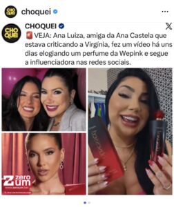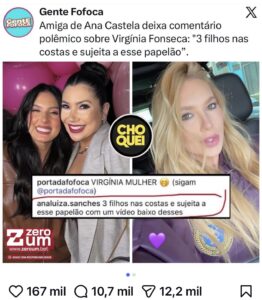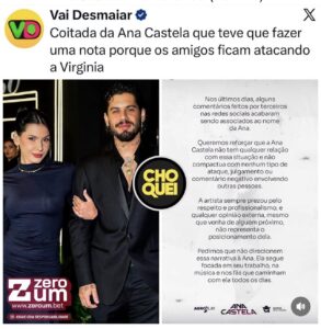 O comentário de Ana Luíza, que é amiga da cantora sertaneja Ana Castela, atual namorada de José Felipe, citava a letra de uma música divulgada por Virgínia. A interação rapidamente viralizou, foi replicada por páginas de entretenimento e provocou debate. Assim, o que parecia apenas uma opinião virou o grande babado do fim de semana.