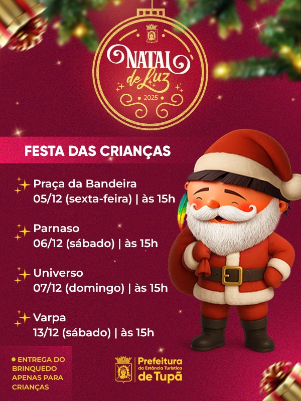 A Prefeitura reforça ainda que a distribuição de presentes será feita somente para as crianças que estiverem presentes no evento, tanto na área urbana quanto nos distritos.