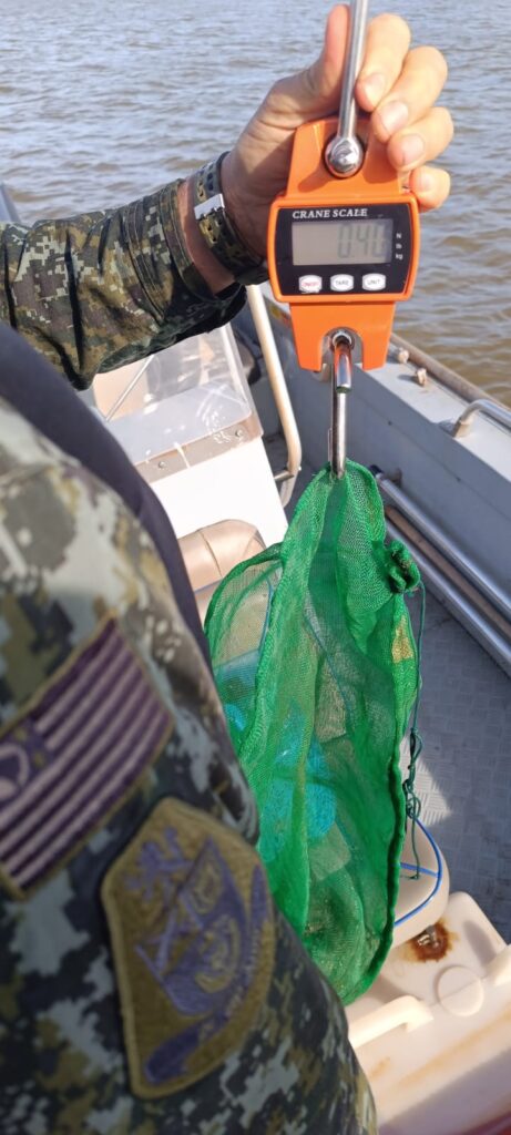 Na embarcação, foi localizado um samburá contendo 400 gramas de camarão pitu (Macrobrachium rosenbergii), armazenados no viveiro de peixes.