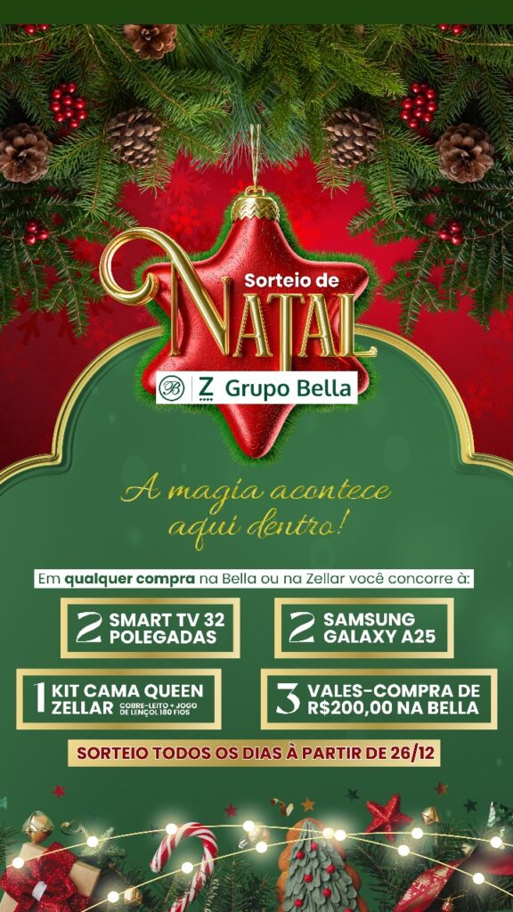 A cada compra, o cliente concorre automaticamente a: 2 Smart TVs de 32”, 2 Samsung Galaxy A25, 1 Kit cama Queen Zellar, e 3 vales-compra de R$ 200 na Bella.