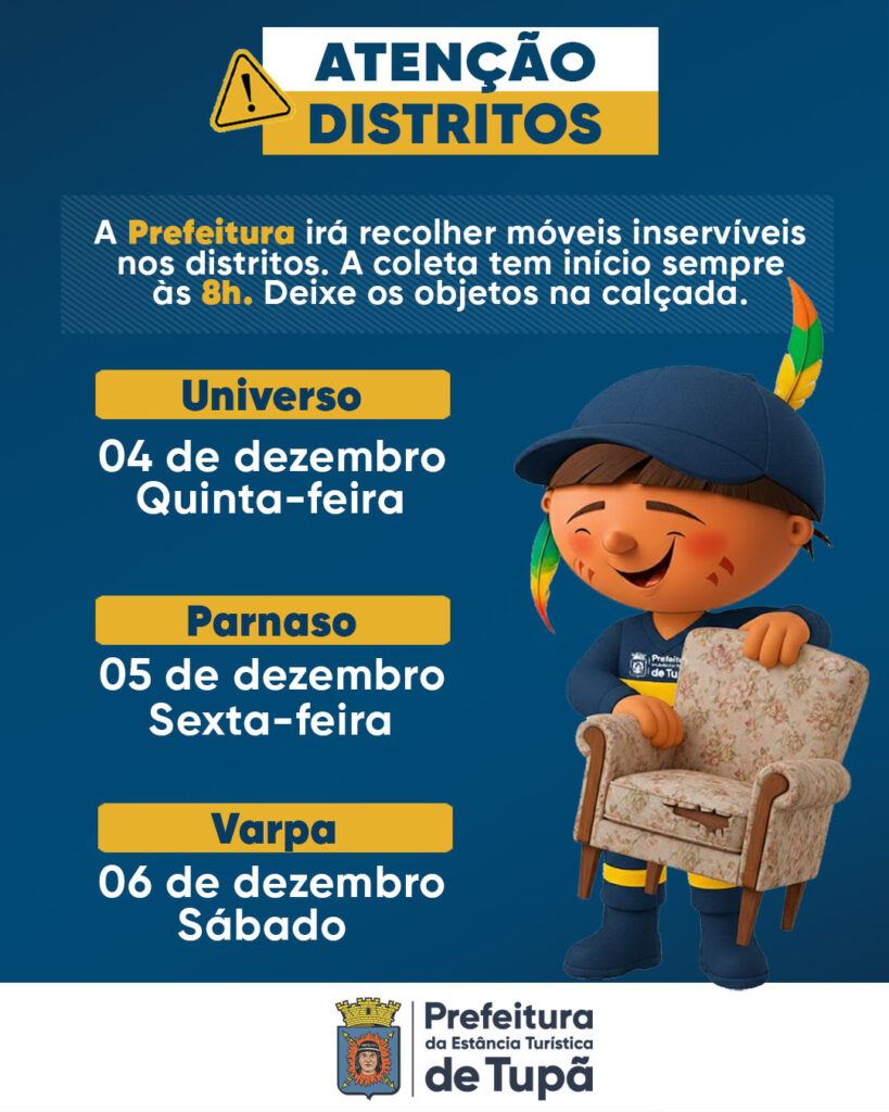 A Secretaria de Meio Ambiente vai realizar o trabalho de recolhimento de móveis inservíveis e outros objetos nos distritos.