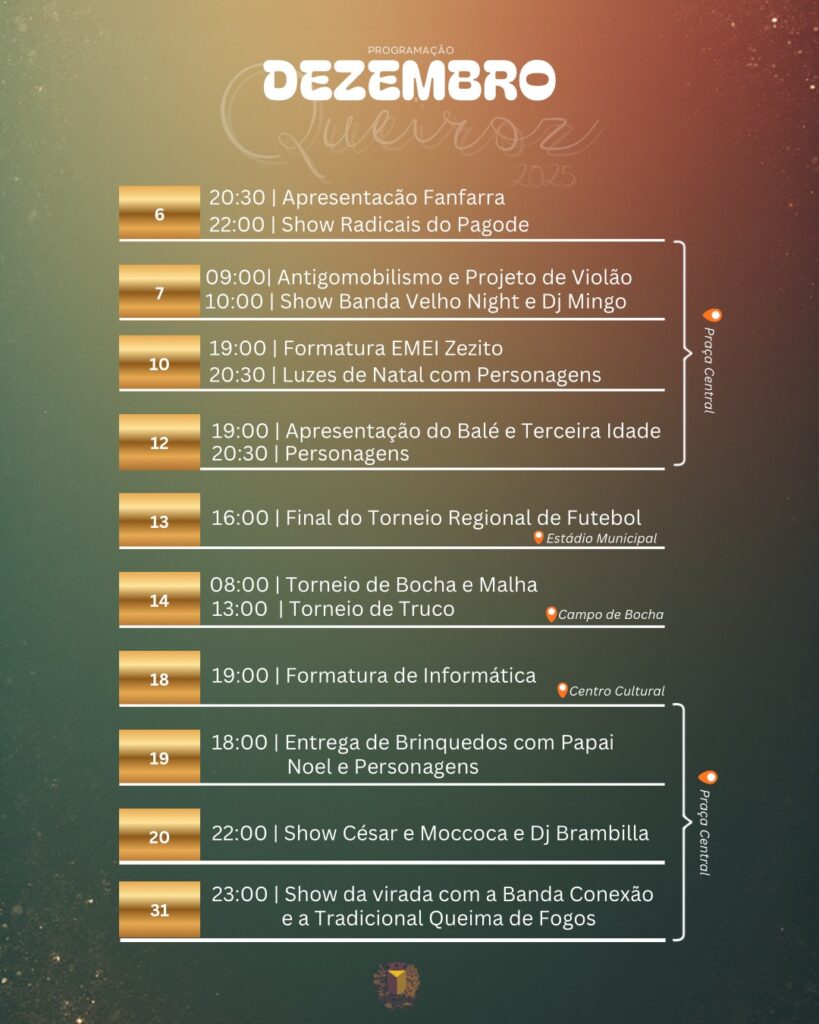 A Prefeitura Municipal de Queiroz organizou uma ampla programação de eventos culturais, esportivos e natalinos que prometem movimentar a cidade durante todo o mês de dezembro, reunindo moradores e visitantes na Praça Central, no Anfiteatro e em outros espaços públicos.