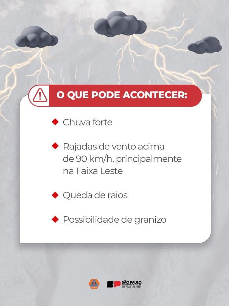 A Defesa Civil do Estado de São Paulo emitiu um alerta para a ocorrência de tempestades severas entre terça-feira, dia 9, e quinta-feira, dia 11, devido à passagem de um ciclone extratropical que deve intensificar as condições de instabilidade em todas as regiões paulistas.