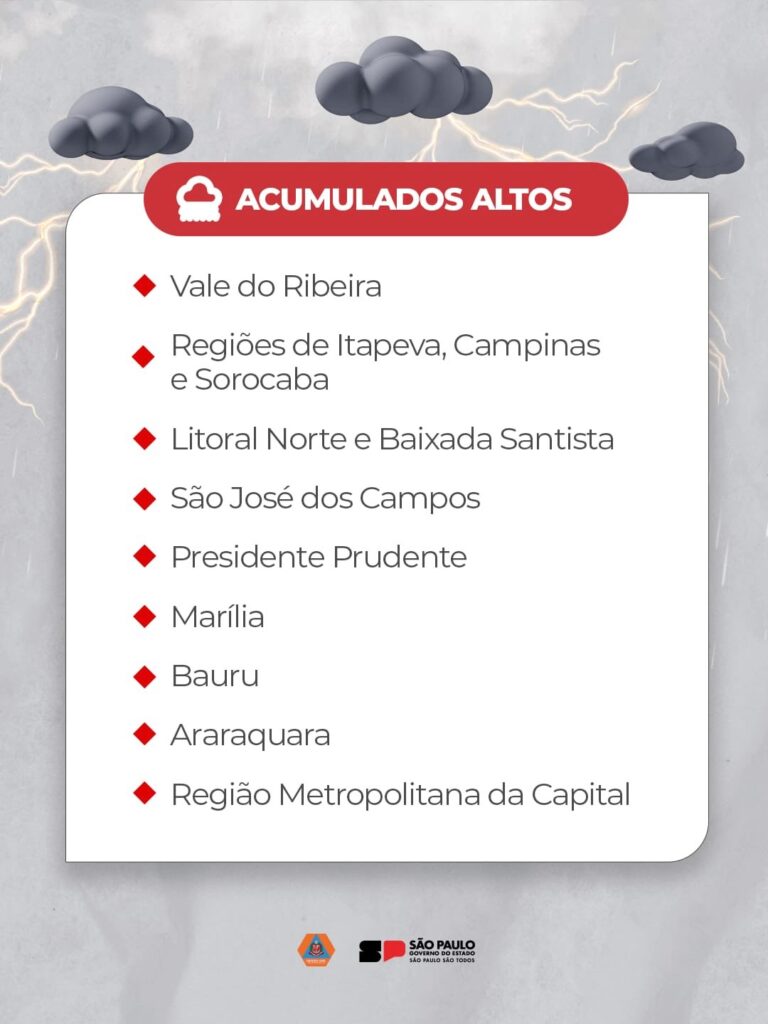 Segundo o comunicado, os acumulados de chuva variam conforme a região. Os volumes muito altos são esperados na Serra da Mantiqueira, enquanto acumulados altos estão previstos para o Vale do Ribeira, regiões de Itapeva, Campinas e Sorocaba, Litoral Norte e Baixada Santista, São José dos Campos, Presidente Prudente, TUPÃ, Marília, Bauru, Araraquara e Região Metropolitana da Capital.