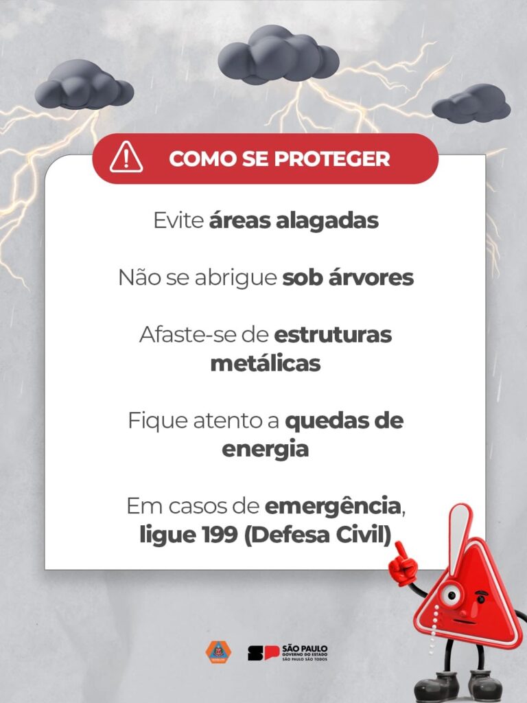 A Defesa Civil orienta que moradores evitem áreas alagadas, não se abriguem sob árvores, mantenham distância de estruturas metálicas e fiquem atentos a possíveis quedas de energia.