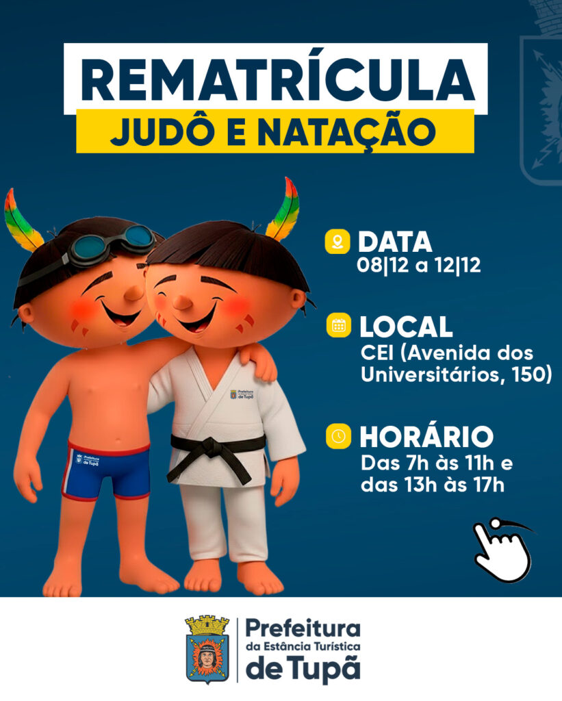 Nesta segunda-feira (08), a Secretaria de Educação dará início ao período de rematrículas das modalidades de Natação e Judô, que se estenderá até o dia 12 de dezembro, das 7h às 11h e das 13h às 17h, no Centro de Educação Integrada (CEI), localizado na Avenida dos Universitários, 150.